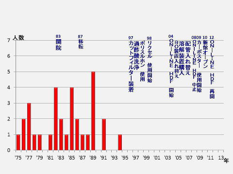 そこで、当院の透析アミロイド症の発症状況とアミロイドの原因物質であるβ2MG(ベーターツー・ミクログロブリン)のデータについて、当院の歴史と照らし合わせて調査しました。